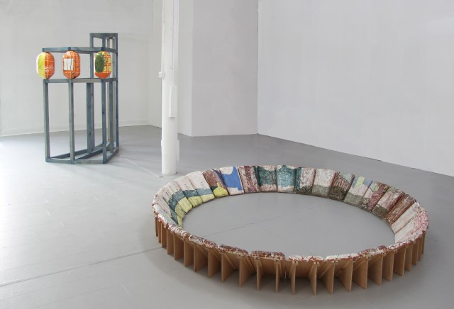 The exhibition Unter Anderen Dingen Waren Sie Unter Sich (Among Other Things They Were By Themselves) consists of two sculptural objects. The first called Unter Anderen Dingen (Among Other Things) is almost two and a half meters in diameter and consists of thirty-one ceramic panels held by wooden stands. The shape of the piece is based on empty gasometers. The images, made with coloured slips on clay, are motifs from the borders between industry, nature and housing in British cities. The second object in the exhibition is called Sie Waren Unter Sich (They Were By Themselves) and consists of a wooden structure with three oval-shaped ceramic objects within it. The piece is about domestic architecture, parti- cularly 19th century British tenement housing that charac- terises the city of Glasgow. The imagery scratched on the oval-shaped ceramic objects are the facade of a house and a spiral staircase. Within both works I define the relationship between the materiality of the human and the sculptural body.