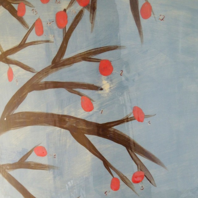 Anregung für die Malerei auf diesem Objekt stammt aus einem Buch über die Rehabilitation von neurologischen Traumata. Es wird die Situation eines Patienten beschrieben, der durch eine Verletzung im Hirn visuelle Störungen hat. Um mehr Verständnis für die Störung zu bekommen, wurde ihm eine Fotografie von Sonnenblumen vorgelegt und der Patient sollte sie abmalen. Auf der Suche nach Orientierung hat der Patient das Foto immer wieder gedreht. Dadurch haben sich grobe Verschiebungen in seiner Zeichnung ergeben. Er war nicht in der Lage, Vorder- und Hintergrund zu unterscheiden, noch war es ihm möglich, die Formen miteinander in Zusammenhang zu bringen. Und doch ist es ihm gelungen, uns in der schließlich entstandenen Arbeit etwas ganz Wesentliches über die Sonnenblume mitzuteilen. Ein extremes Beispiel für den Versuch jedes einzelnen Menschen sich in einer Welt aus vorgefassten Kategorien und Etiketten zu orientieren.