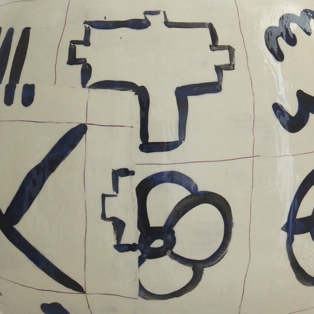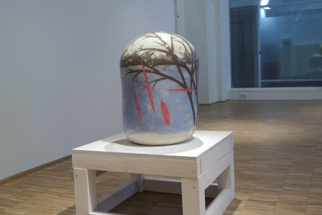 The exhibition Vermessung und Gewicht (Measurement and Weight) consists of ten oval-shaped, almost symmetric, ceramic objects standing on wooden beams. The clay bodies are painted with engobes, carved and glazed. The wood is rough and stained in a translucent white. As in many of my other works, this series of sculptures was influenced by a book, Geographies of Dis-Orientation by Italian geographer Marcella Schmidt di Friedberg. She explores the topic of Orientation and its opposite, Dis-Orientation and how they affect our relationship with space, place, body, emotion and time.