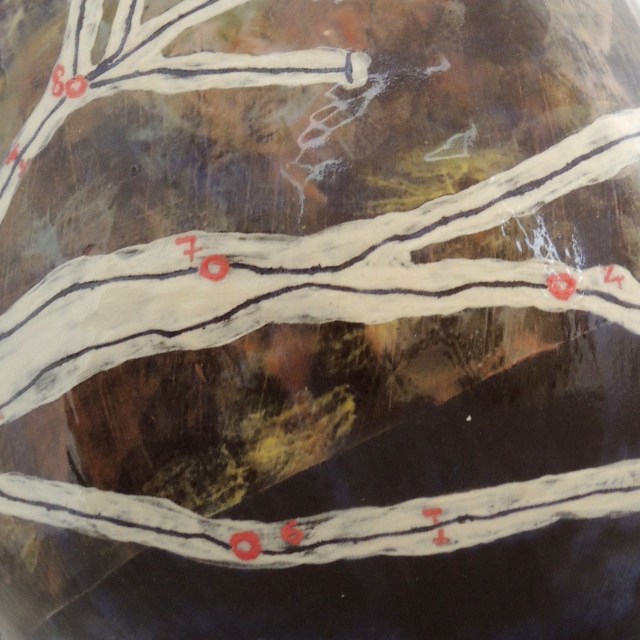 Die Ausstellung Vermessung und Gewicht besteht aus zehn ovalen, annähernd symmetrischen Keramiken, die jeweils auf einem vierbeinigen Holzträger stehen. Die Kerami- ken sind mit Engoben und Glasuren bemalt und Zeichnungen sind in den Ton hineingeritzt. Das Holz hat eine raue Oberfläche und ist mattweiß und durchscheinend gebeizt. Wie auch andere meiner Arbeiten, ist die Skulpturenreihe von einem Buch angeregt worden: „Geographies of Dis-Orientation“ von der italienischen Geografin Marcella Schmidt di Friedberg. Darin erkundet sie das Thema der Orientierung bzw. der Orientierungslosigkeit und dessen Einfluss auf unsere Beziehung zu Raum, Ort, Körper, Emotion und Zeit.